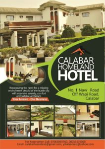 Calabar Homeland Hotels, No.1 Navy Road/ 68 Ayade Boulevard, (Behind W.A.P.I), Calabar, Cross River State, Nigeria.